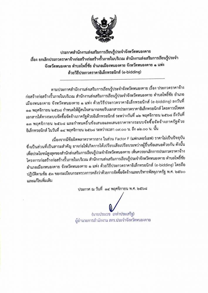 หัวข้อเรื่อง : ยกเลิกประกาศประกวดราคาจ้างก่อสร้างรั้วภายในบริเวณ สำนักงานส่งเสริมการเรียนรู้จังหวัดหนองคาย